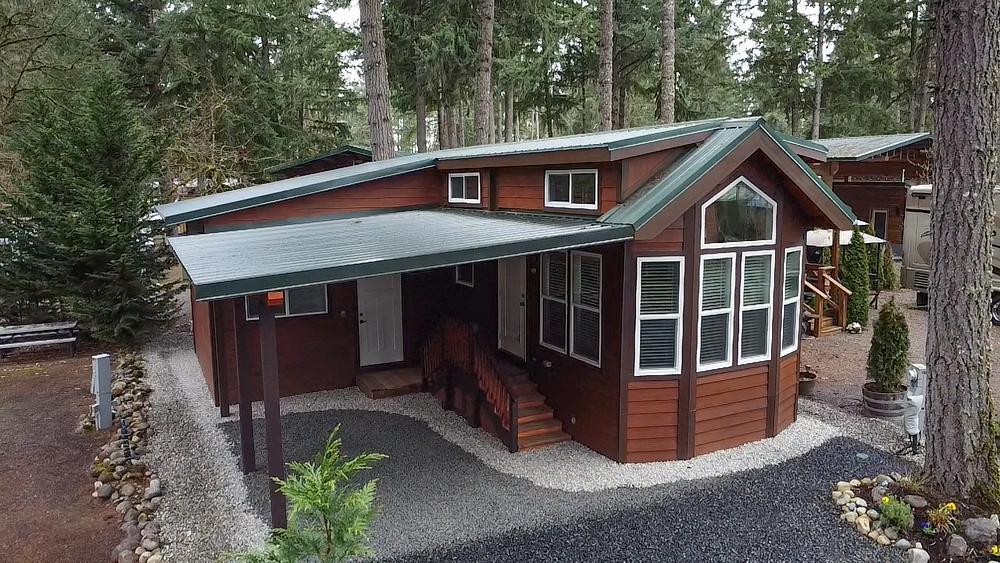 10 Maple - Brand-new cabin with loft located in the beautiful Lost Lake Resort community! This thoughtfully designed retreat features ductless mini-split heat and A/C in both the living area and bedroom, providing efficient year-round comfort. The interior showcases modern white cabinetry throughout with stylish black accents, including a striking black farmhouse sink and coordinating black bathroom fixtures. Cathedral ceilings and a layout create a bright, spacious feel, while durable vinyl plank flooring runs throughout the home for easy maintenance and a clean modern look.The kitchen comes fully equipped with a gas range, microwave, refrigerator, washer, and dryer, making this cabin move-in ready. A newly built 16 x 15 attached shed is fully finished and includes a full bath with tub and closet offering excellent additional storage or flexible space for guests, hobbies, or recreational gear. The exterior features fresh black gravel landscaping with a defined border for a polished appearance and low-maintenance upkeep. Enjoy everything Lost Lake Resort has to offer, including swimming pool, sauna, workout facility, pickleball courts, mini golf, playgrounds, and a welcoming clubhouse that hosts community activities and events. Outdoor enthusiasts will love easy access to Lost Lake for fishing, swimming, and kayaking, along with nearby scenic hiking trails. This property offers the perfect opportunity for a relaxing getaway full time or part time living.
