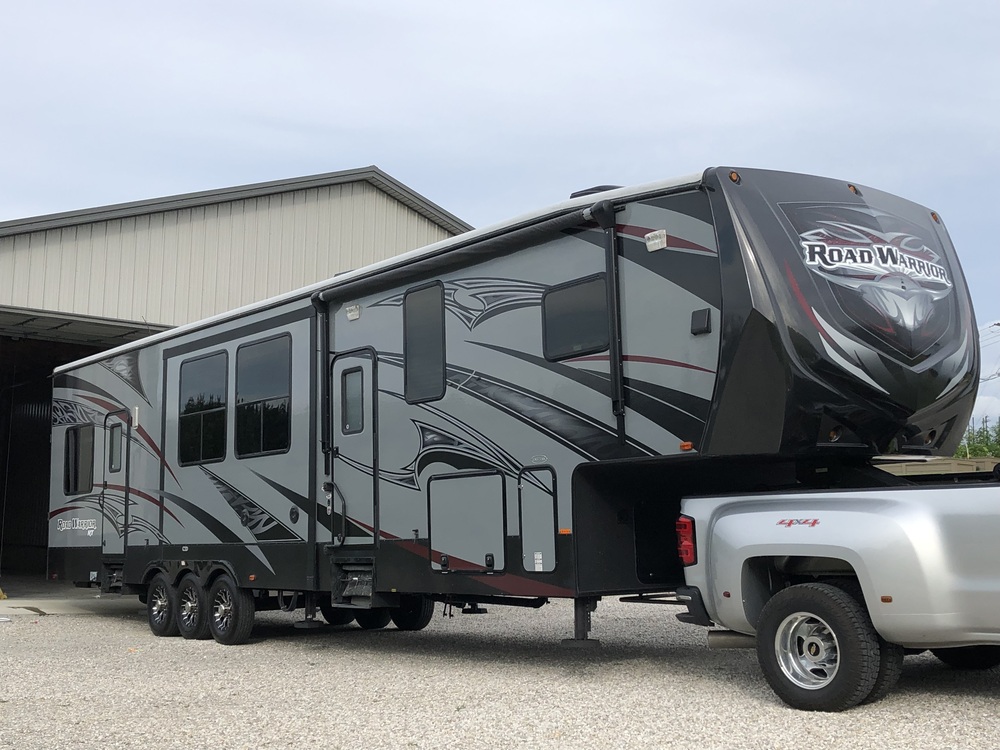 Pre Covid Fifth wheel. Garage kept 44 ft Toy hauler. 3 axels. 18k gvwr. Stickered dry weight 14,862. 6 point hydraulic level up system. Onboard Onan generator (672 hrs). 30 gallon fuel tank with fuel pump for toys. 12 ft garage with upgraded 3 season door system (screen, clear and blackout). Party deck with rails. Sleeps 10/11. 3 hydraulic slides. 2 awnings. Led interior lights and awning lights. Large pass through storage. Fireplace with remote, outside wet bay and shower. Large master closet. Outside stereo. Inside surround sound. Two fresh water Tanks (110 gallon total. 65 gallon black and two 65 gallon grey tanks. 2nd owner. Selling due to kiddos getting older and we bought a smaller camper.