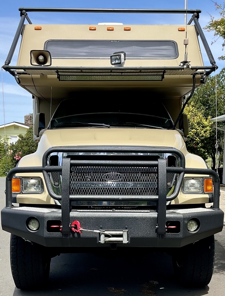This unique F750 4x4 Toyhauler Earth Roamer HD style was designed and professionally modified to be able to go places you shouldn't with safety and comfort. Entire coach exterior recently painted with two tone bed liner material for off road durability. 15k front winch,1600 lb rear lift gate, 20000lb towing capacity, HD bumper w/ bull bar, protective rails and racks, smash and grab window coating, aux cab locks, multiple LED work and driving lights, communications deck w/ CB, GPS, Cellphone booster, Radio antennas and external speaker. Exterior entertainment center with TV. Large basement storage. 8KW diesel, solar panel,50amp shore power with cable, cable TV, water hookups. Outside shower, two new 55 gal fuel tanks. Jerry can and extra water storage area. Tires high flotation front, dual rear 98%. Under mounted spare lifted with electric winch.Rear bay 10'+X8', adjustable tie downs, roof access. Converts to master suite with TV,AC, curtains, inflatable bed. Cab- leather electric heated seats, AC/heat, retractable radio W/ AM,FM,Seris, blue tooth, GPS, phone interface. CB, cell phone booster, multiple USB and 12V plugs. Coach- Queen bed in peak, electric folding couch/bed, In motion SAT TV, DVD, entertainment distribution panel. Electric/propane water and coach heater.Folding bar/table 2 stools,footrests,multiple cabinets wardrobe,rifle/fishing rod rack.Kitchen- stove, microwave convection oven,double sink, water filter. Dry bath- separate shower, sink in cabinet, toilet, medicine cabinets.Possible financing available