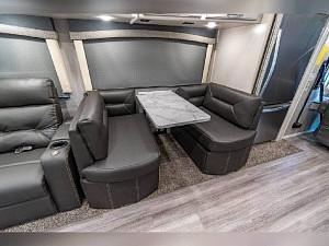 A couple photos and video are stock images used for clarity and presentation. Differences from stock video include no drop-down bed, no blue exterior accents, and the seating configuration noted above. Please refer to actual photos for finishes and layout details. Theater recliners also function as part of the sleeping capacity.