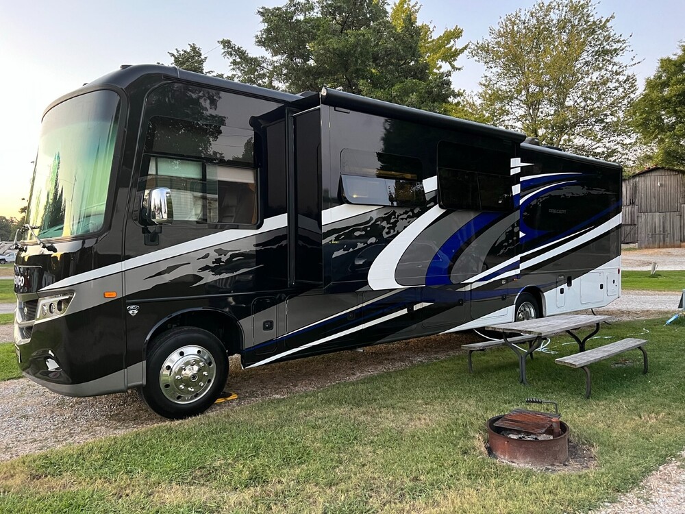 Like NEW Condition with GORGEOUS FULL BODY PAINT! The Oceancrest paint scheme is stunning! A beauty with a modern and comfortable interior, stainless appliances plus a must have FULL size residential refridgerator making it a PERFECT home away from home! Powerful and efficient "Godzilla" 7.3 gas engine tows our Jeep Grand Cherokee Summit edition (which can be included $15500 more). This coach is in Like NEW condition, nonsmoker, pet free, garage kept and complimented with immaculate Alloy wheels. You can stretch out and relax in the comfy, power recliners while streaming your favorite "SUITS" episode, with a great viewing angle, and keep cozy with the heat producing, color-changing gas logs. Bring your family or friends along on your next glamping adventure where they can sleep on a spacious queen sized drop down bed or you can use it for convenient, extra storage space! You will not miss a butte or peak as you travel in sytle with the HUGE 120 degree panoramic windshield. The large bathroom and oversized shower area is a plus. Like your space when you sleep? The King sized bed is divine!! You'll find gracious storage in the lockable bins underneath the coach for chairs, coolers, golf bags, ladder, grill, mats, fishing rods, blowers and anything you need to make your dream vacation come true. The J-Ride steering assist package makes this coach a true joy for everyone to drive. We just traveled across USA and it did absolutely perfect! The Onan generator has less than 30 hours. The motorhome has 3 flat screen TV's, 2 slideouts and 2 heat pumps plus the best option ever.a TANKLESS WATER HEATER!! You will LOVE this option and never be without it again! The kitchen has an oversized sink with tall faucet to easily wash the griddle or large cookware. You will ride and rest in style, wrapped in comfort, when you purchase this condo on wheels. Email, text or call me with any questions.