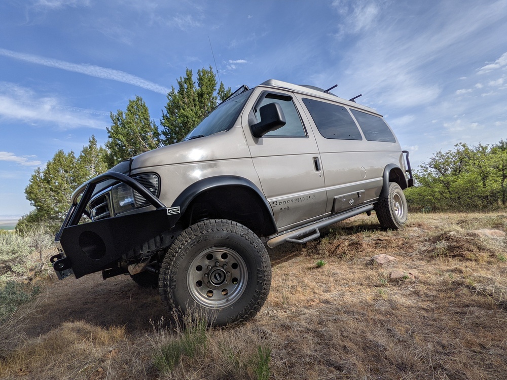 2010 Sportsmobile conversion. 2003 F-350 6.8L V10 chassis. CLASSISC, CAPABLE, TESTED, OVERLAND READY. Rare full wrap windows. New: tires, shocks, driveline, battery, roof rack, bumpers, winch, and cargo box. 2003 passenger van converted by Sportsmobile in 2010. No engine or compartment leaks. Canvas in great shape. Second owner, meticulously maintained. Quigley 4x4. Awning. Seatbelts for 6. Propane heater and refrig. Microwave. Wired for solar.