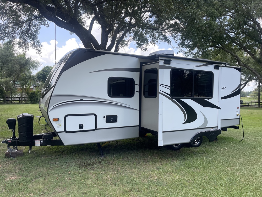 KEYSTONE COUGAR 22RBS Great two person RV, Very clean and kept in covered storage. Used only three times. This 1/2 ton compact unit features a Luxury full Kingsize bed with lots of storage above and below. The living area has two theatre Reclining seats with massage and heating, face a 40" TV flat screen. A full size kitchen with double stainless sinks, a 3 burner gas stove and oven, plus a microwave. The electric-propane refrigerator is generous for two people. The bathroom is spacious with a shower with a skylight, a toilet and sink with a storage cabinet and mirror. The a/c unit and tires have recently been replaced with only 200 miles on them. Included is a weight distribution hitch. Pass through storage bay with leveling jacks. One slide out, tinted windows, digital tv antenna, Full Awning ,surround sound stereo system. Flooring heat and much more. Phone Call