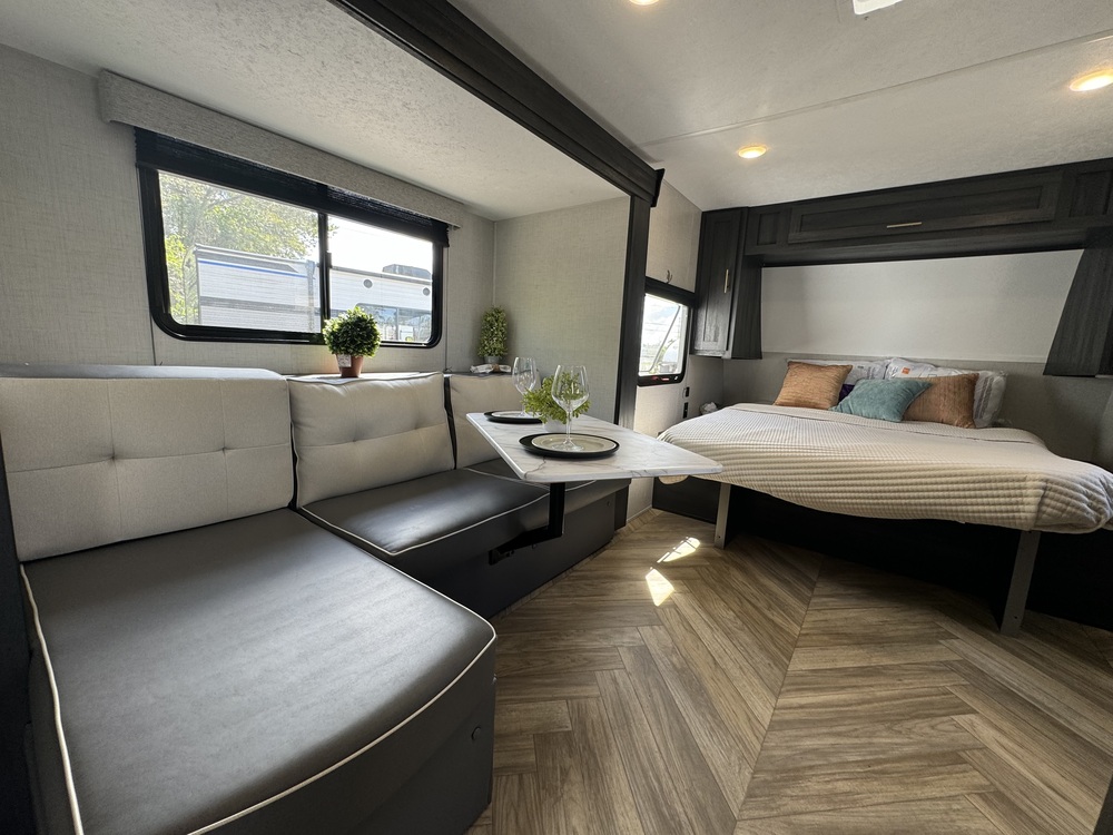 Spacious & lightweight 3,789 lbs 23 ft perfect for solo adventurers or couples. Offers a comfortable and stylish interior with cool design wrap around couch & entertainment center flat screen tv. Rv tech inspected ready for travel all start up accessories & new bedding flat screen included!