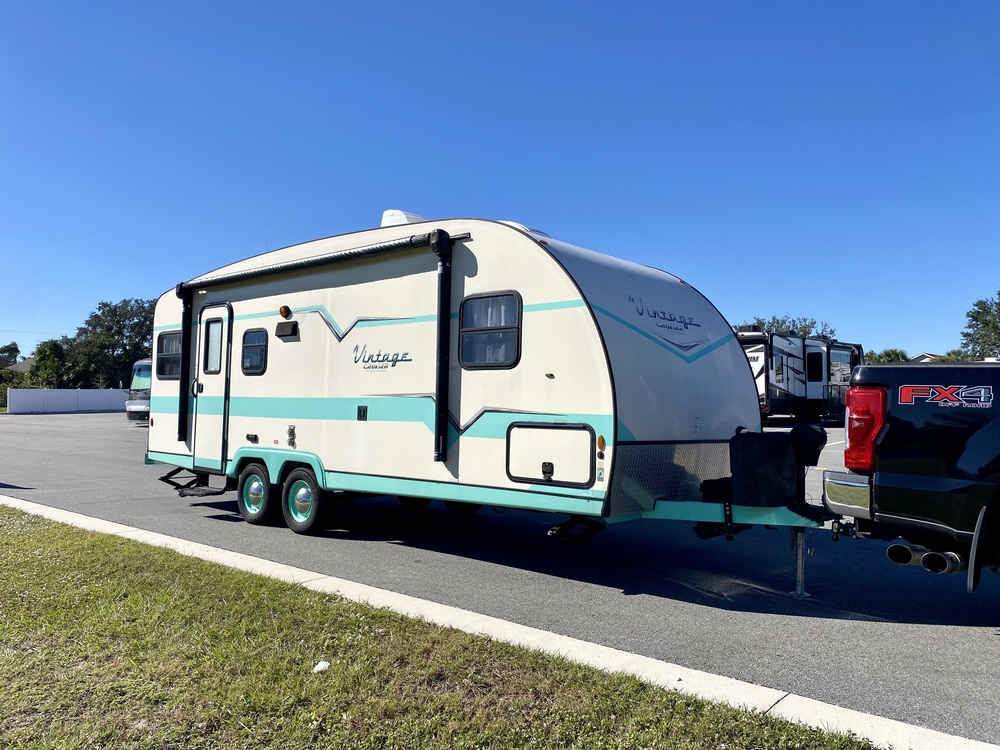 Features a new awning, new upholstery, new curtains, new curtain rods, and a new battery along with the original Vintage Cruiser branded pillows.
