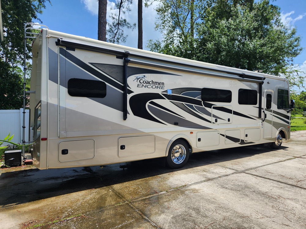 This 2021 Coachmen Encore 355DS is a spacious Class A motorhome purchased new in 2021, original owner. It has 14,850 miles on the odometer. It has the powerful 7.3L V8 gasoline engine. Oil changed every 5000 miles. Michelin tires in excellent condition. It has been kept under an RV Port since new. All manufacturer defects have been corrected and is in excellent condition. With the opposing slide outs, The 355DS floor plan offers plenty of room for you and your family or friends to travel in comfort. Can easily sleep 8 with King Size bed w/upgraded mattress, drop down dinette sleeper, pull out sofa sleeper, and electrically operated drop down bunk over cockpit seating. Speaking of seating, there is power recliners w/heat and vibrating massage for watching TV. This unit has 4 TV's. Kitchen has SS Farmhouse sink, 3 burner propane cooktop, and convection/microwave oven. Washer and dryer makes it easy to maintain your laundry while traveling. Onboard Yamaha generator makes Boondocking or overnight stops at Cracker Barrel possible.