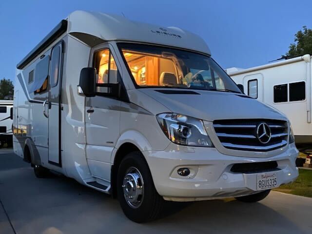 A driver's side slide-out, while not required to deploy the bed, adds extra room when extended, making the interior more spacious. Inside, you'll find a full bathroom, a well-equipped galley, and a generous dining table, cherry chestnut wood cabinetry, white corian countertops, built-in spice rack, pull-out pantry cabinet, stainless steel sink, chrome faucet and fridge, gas burners with a splashguard and a microwave convection combo oven. The oversized reclining, swiveling theater seats in Fog Ultraleather ensure comfort while relaxing. The cherry chestnut wood cabinetry, paired with matt white glamour cabinets and wood trim, creates a stylish atmosphere. High-quality finishes and thoughtful touches are evident throughout this motorhome. Another upgrade is the Alcoa Aluminum wheels. The Unity MB24 is built on a Sprinter chassis with a fuel-efficient 6 speed diesel engine that gets 16 to 20 miles per gallon. The vehicle is also equipped with a top mounted Winegard antenna WiFi booster, solar panels for off-grid power, upgraded Lithium House Battery, and a generous awning that provides ample shade for outdoor relaxation and generous storage compartments to stow away all your essentials. This Class B motorhome has been well maintained, stored in covered, secure storage for the past two years. Only two owners -- the first owner kept it in an indoor RV storage garage in Texas. Service and maintenance records are available. Up to Cloud's Rest in Yosemite, along Scenic Byway 12 in Utah and beyond, it is ready for adventure! Click on the video link for a new release Tour of the model w/ Dean of LTV.