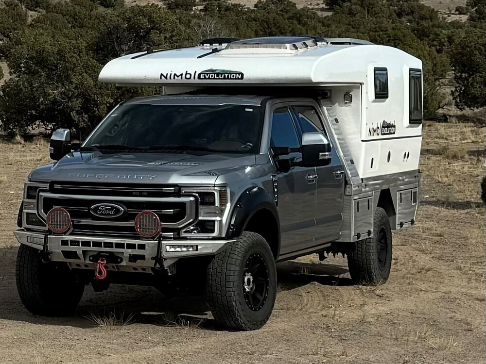 This is a rare Nimbl overland vehicle (truck and camper) for sale. The camper sits on a custom flat bed with many truck upgrades. The 4X4 F350 Platinum is lifted with Carli components, custom front and rear bumpers, Come Up wench, fog lights, gas powered V8 that has plenty of power. Camper has 4 Lithium house batteries providing 400 aH and 570 watts of solar on roof. Heated 75 gallon fresh water and 24 gallon gray, cassette toilet, full shower, spacious double bed, two burner induction cook top, DC frig with freezer, tons of storage inside and out. Furnace and hot water heater fueled from truck gas tank, no propane. Always been garaged. Contact me for more details.