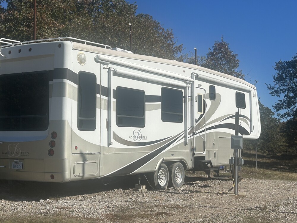 DRV is built better than the rest!The DRV Mobile Suites is a luxurious fifth-wheel trailer that exudes sophistication and elegance. With a sleek exterior design and top-of-the-line features, this 2008 model is sure to impress even the most discerning travelers. The Mobile Suites is known for its spacious interior, offering ample room for relaxing and entertaining. The high-quality craftsmanship is evident in every detail, from the premium materials to the exquisite finishes.Inside, the DRV Mobile Suites boasts a well-appointed living area with comfortable seating, 2 recliners and sofa with bed. and plenty of storage space. The kitchen has island, large sink, convection microwave. gas cook top. The bedroom has plenty of storage for all your belongings. The bathroom is equally luxurious, featuring shower, medicine cabinet, large storage cabinet, and a vanity with plenty of counter space.The DRV Mobile Suites fifth-wheel trailer is a true home away from home. With its timeless style great floor plan the DRV Mobile Suites, 2008 model offers a truly unmatched experience.