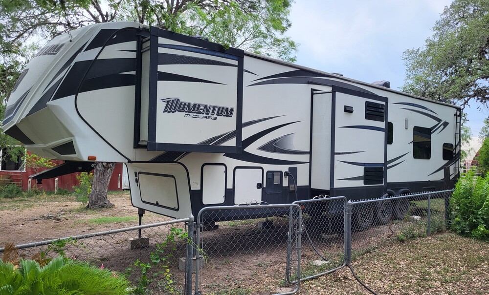 The 2016 Grand Design Momentum 388M is a luxurious fifth wheel toy hauler trailer that is perfect for those looking to travel in style and comfort. This spacious trailer offers all the amenities of home, including a fully equipped kitchen, Washer connections, a cozy living area, and a comfortable bedroom. The exterior of the Momentum 388M is sleek and modern, with a striking design that is sure to turn heads wherever you go. Inside, you'll find high-end finishes and top-of-the-line appliances, making this trailer a true home away from home. The living area is spacious and inviting, with plenty of seating for relaxing or entertaining guests. The kitchen is well-appointed, with stainless steel appliances, solid surface countertops, and plenty of storage space for all your cooking essentials. The bedroom in the Momentum 388M is a true retreat, with a comfortable King-sized bed, plenty of storage space, and a private bathroom with a spacious shower. This trailer also features a separate bunkhouse area with 1/2 bath, perfect for guests or children. On the outside, the Momentum 388M offers plenty of outdoor living space, with three awnings, and exterior speakers and TV for enjoyment outdoors. This trailer also features plenty of storage space for all your outdoor gear, including kayaks, bikes, and camping equipment. The garage area is 14 foot and has couches and a table. and the ramp converts into a porch. This unit also has the onboard Onan generator (35 hrs.), fulling station, and auto leveling. Overall, the 2016 Grand Design Momentum 388M is a top-of-the-line fifth wheel trailer that is perfect for those looking to travel in luxury and style. Whether you're headed out on a weekend camping trip or embarking on a cross-country adventure, the Momentum 388M has everything you need to make your journey comfortable and enjoyable. This unit makes a great full time live in for contractors as well. We used it when my daughter was young and raced small sailboats that we hauled in it but no longer need it. Kept at our farm plugged in with a/c's on.