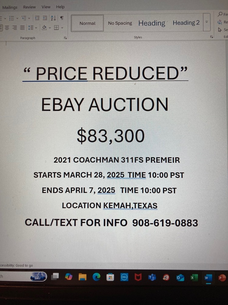 COACHMAN 311FS PREMIER LEPRECHAUN PURCHASED OCTOBER 2020CHASSIS FORD F-450 GASOLINEPACKAGE UPGRADES INSTALLED BY COACHMANPREMIER PACKAGE Sideview Camera Convection Microwave 6 gal gas & electric water heater Heated Remote Sideview MirrorsCRV SUPERSPRING RIDE Sumo Spring Front Shock Absorbers Super Spring Rear Self Adjusting Helper Spring Chassis Electronic Stability Control Dynamic Balanced Driveshaft System Heavy Duty Front and Rear Stabilizer BarsCOSY COMFORT Double pane windows Heated Holding Tanks Extra Shutoff valves Extra InsulationDESIRED LIFESTYLE CONVENIENCES INCLUDED Dual Air Conditioners Dual Propane Furnaces 4 KW Generator capable of powering utilities Washer/Dryer Combo 3 Burner Propane Cooktop No Odor Flush Toilet Residential Refrigerator Hydraulic Jacks Smart TVs (3) Wifi/Router for Internet Navigation systems Security System Blue Ox Towing Equipment Swivel Chairs in the Cab Cockpit table Painted Interior 1000-Watt Inverter Extra 110v Outlets Additional 50 Amp Service 30 Amp Surge Protectors (2) Secondary Electrical Panel Ship to Shore Switch Ammeters (2) Garmin Dash Camera DC66W Garmin Chartplotter RV 890 6 Info System Touch Screen/ Radio\Chart Plotter Voyager Backup Camera CB Radio King Wifi w/ Router Cell Phone WeBoost System Big Foot Hydraulic Jacks Snappads for Jacks Simply Safe Security System Seven Camera Fire Pit Grill Patio Table & Chairs Vacuum Cleaner Electric Skillet Hot Plate Fenced Dog Pen w/ artificial turf