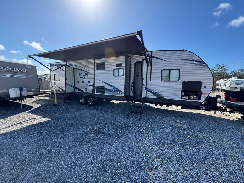 2019 XLR boost Forest River Travel Trailer Toy Hauler39 foot - Model 31QBTwo slidesNew Awning lights with remote controlHalf bath in the garageExtra refrigerator in garageTwo queen bunkbeds with mattresses in the garageGarage has two benches and a table that turn into bedsGarage opens up to a deck with fencing and screenGarage will hold a 6-seater jacked up golf cart with extra roomTires one year old / 5000 miles or less and tire coversStabilizers trailer hitchFront & Rear electric landing gearUpgraded mattress in the primaryIncludes everything from flat top grill, tables, chairs, decorations for holidays, utensils, pots, pans, glasses, bedsheets, towels,, lights, table covers, etc…3 TVs30-gallon gas tank for fueling your toys with locking cap and tank gaugeHot water heaterAll lines for black water, grey water, potable water and filters includedWired for generator (generator not included)Brand New outdoor speakers