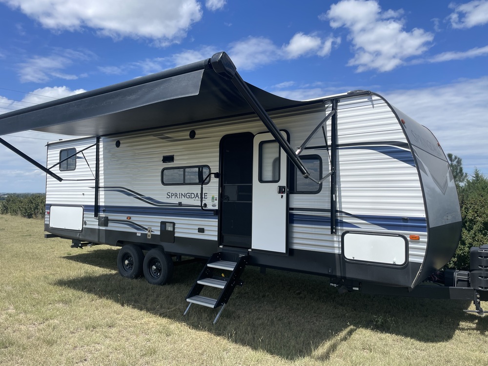 The 2022 Keystone Springdale 298BH is a top-of-the-line travel trailer designed for those who want to experience the great outdoors in style and comfort. With only 2000 miles on the odometer, this unit is practically brand new and ready for your next adventure.The Springdale 298BH features a spacious interior layout with room to sleep up to 6 people, making it perfect for family vacations or trips with friends. The neutral color scheme and modern decor create a warm and inviting atmosphere, while high-quality materials ensure durability and longevity.Inside, you'll find all the amenities you need for a comfortable stay, including a fully-equipped kitchen with stainless steel appliances, a cozy living area with a flat-screen TV, and a luxurious bathroom with a spacious shower. The private bunkhouse room in the back is perfect for kids or guests, offering a separate space for relaxation and sleep.On the exterior, the Keystone Springdale 298BH boasts a sleek design with attractive graphics and plenty of storage space for all your camping gear. The power awning provides shade on sunny days, while the outdoor kitchen allows you to cook and dine al fresco.Whether you're hitting the road for a weekend getaway or embarking on a cross-country journey, the Keystone Springdale 298BH is the perfect companion. Don't miss out on the opportunity to own this exceptional travel trailer and make memories that will last a lifetime.