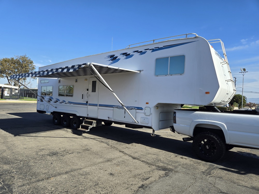 Used 2004 WEEKEND WARRIOR 3505SLC Toy Hauler for sale. 35' Tri-Axle 5th wheel. Queen Master Slide-out, Onan Gold Marquis 5500 generator, 2 AC Units, New Patio Awning, LED lighting, Roof Solar panel for battery system, 2 LED Tv's, Dish Playmaker Satellite System, New Queen Memory Foam mattress, 105 Gal water capacity, 32 Gal Fuel pump station, Lot's of storage capacity.
