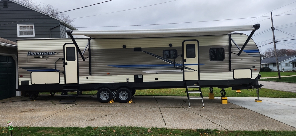 large bunk house with upgraded mattress, with a toy box and plenty of storage and television. brand new living room jack knife couch. 80" u shaped dinette, big enough for 2 full size adults. outdoor kitchen with fridge, griddle, and grill. 120 volt receptical inside the kitchen and lights. the 19 ft. awning is the largest in the industry. the camper is non smoking, and no pets. all storage doors have magnetic door catches.