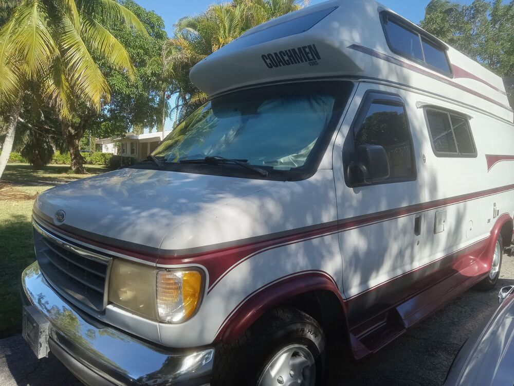 1996 Coachman on Ford E250 Chassis. Ready for the Summer! Reduced price to sell. Model M-19 RD Ford. Rear Dinette. Good condition, everything is working. Clean Title. center couch folds down to make double bed. Clean kitchen, sink, 2-burner stove, 3-way refrigerator. Convenient toilet with curtains for privacy. Outside shower, Wonderful for 2 people. Lots of storage.