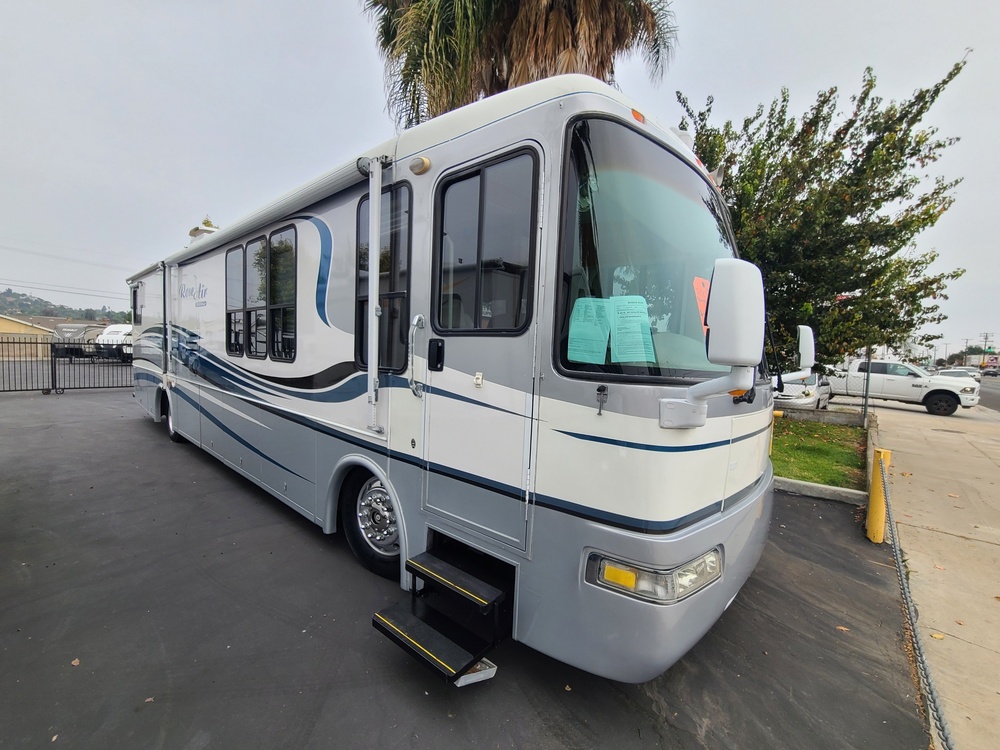 2003 Rose Air 3950 diesel pusher by Rexhall with a Cummins 350hp. Double slide out with a large bedroom slide and large bedroom slide out. Sleeps 4, rear walk around bed, L-shaped couch/sleeper. Ducted heating and cooling systems. Kitchen has a residential fridge with ice maker, stove top, microwave/convection oven. Big 7.5 KW diesel generator, power inverter system, Power leveling with air dump, patio awning, window awnings. Mechanically sound with all systems in good working order. Price does not include tax, license and dealer doc fee.