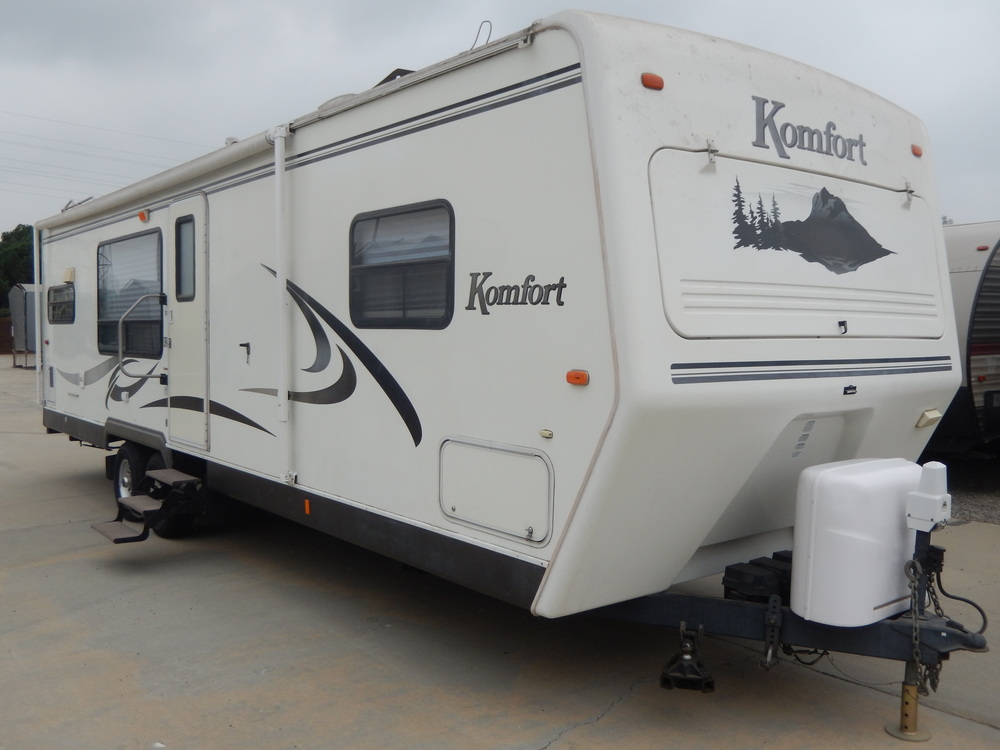 This is a gorgeous 2005 Komfort 28 foot travel trailer. Komfort 282. We are the second owners. It has been kept in excellent condition. Has been stored from day one in an enclosed storage facility. This has all of the features of home. It was a warm and welcoming feeling. It has a sofa that pulls out into a bed. Two recliner chairs with a small table in between the chairs. The kitchen is large and has a double sink. There is a microwave, refrigerator, freezer, 3 burner stove and oven. Plenty of storage space and cupboards. Has a skylight in the kitchen. Features gorgeous wood throughout (cabinets, floors, kitchen table and chairs). The dining room table has 4 upholstered chairs that have storage under each seat. The table is portable and can be taken in and out of the trailer. Also has a rear master bedroom with queen size bed. The bed is situated so that you can walk around the bed, which makes is easy to change the bed coverings. The bathroom has two medicine cabinets, a bathtub and shower, as well as toilet. It also has a large sliding mirrored doors on the closet in the hallway. The upholstery throughout the trailer is in excellent condition. No stains or rips of any kind. It has heating and air conditioning. This is an absolute beautiful trailer .It has leveling jacks for easy set up. Electric jack on the front tongue. Tires are two years old and in great condition. One huge upgraded slide out for living space and dining room. Also comes with rear ladder, tv, stereo, awning, front window cap. Has a rear trailer hitch for a bike rack. Bike rack is not included. This is an absolutely gorgeous home away from home. The layout of this trailer lends itself to a large dining and living area.