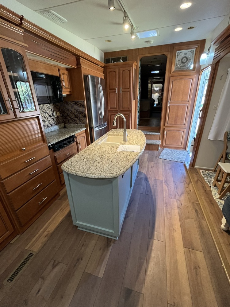 Very nice and well maintained, over the last 6 years or less both A/C’s have been replaced also has G114 Goodyear tires. All hydraulic hoses and all 6 hydraulic jacks have been replaced ! Added plank flooring and has been remodeled throughout the inside. Also removed original refrigerator and replaced with Samsung residential refrigerator also added a inverter at the same time.This trailer has a 2 piece fiberglass roof that you won’t see on a trailer very often.King bed is very comfortable with after market mattress.I had the front cap repainted about 3 years ago. It has a hydraulic problem that Lippert, which is the manufacture of the system thought it was a leaking valve so I changed all eight of them and that didn’t fix the problem so I’m going to sell as is. lt also has a ding on the top right side upper corner where I backed into the eve of my home.I would be willing to make some concessions on the selling price to help with fixing these two problems ! You would need a one ton srw truck to tow it with!