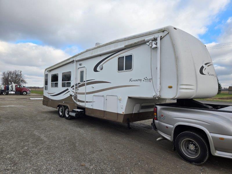 2004 Newmar Kountry Star 34BLSK, 36’1”, Three Slides, Fifth Wheel, Power Front Jacks, Rear Stabilizing Jacks, Two 30# LP Tanks, Rear Ladder, Enclosed Underbelly, Two Ducted AC Roof Units, 35,000 BTU Furnace, Gas/Electric Water Heater, Monitor Panel, Interior Shades, Flat Screen TV, 3 Burner Stove, Oven, Microwave, Upper/Lower Fridge & Freezer, Double Sink, Table & Chair Dinette, Sofa Bed, Dual Recliners in Rear, Vanity Counter, Shower, Washer/Dryer Prep, Wardrobe Closet, Queen Island Bed, Sleeps 4, Patio Awning, Slide Awnings, Beige Interior, Oak Wood, White/Tan Exterior, Approximate Dry Weight: 11,021#