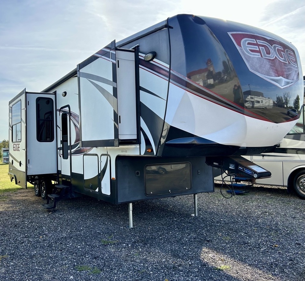 2016 Heartland Edge 357ED fifth wheel RV with a toy hauler area and bath & 1/2. Options include 5.5KW Onan generator, ramp door patio with electric awning and a second 15k A/C. Standard equipment includes twin LP tanks, night shades, exterior shower, rear stabilizer jacks, stainless steel appliances, solid surface countertops in the kitchen, LED lights, 50 Amp service, electric awning, correct track align system, exterior speakers, power front jacks, residential refrigerator, range with oven, alloy rims, tinted safety glass windows and much more.