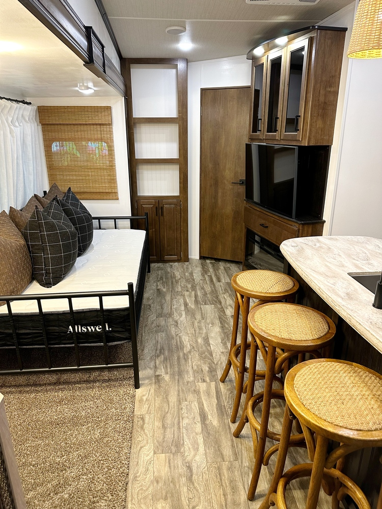 The spacious floorplan includes a private master bedroom with a queen-size bed, a separate bunkhouse featuring a twin bed, and an additional twin daybed in the living area, ideal for families or guests. Brand-new mattresses throughout ensure maximum comfort. The fully equipped kitchen offers a residential refrigerator, large pantry, and deep sink, perfect for hosting and meal prep. A dedicated pet area and walk-in closet ensure that everyone has plenty of space to call their own in this RV.