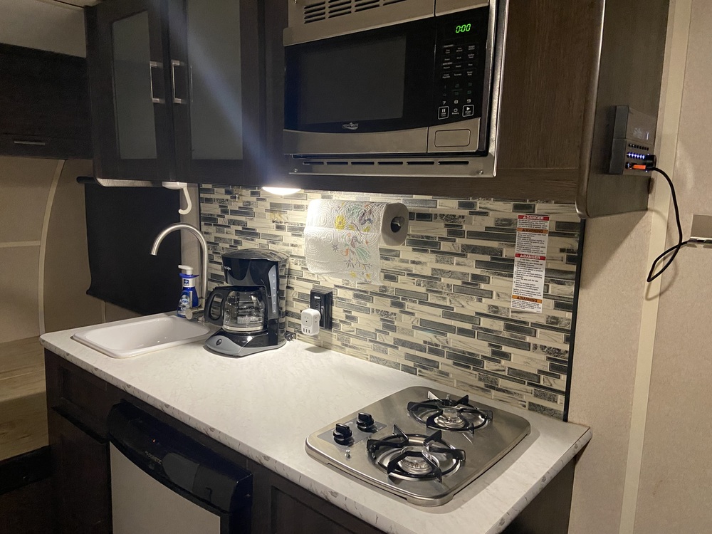 The 2018 FOREST RIVER WILDWOOD FSX 181RTX is a top-of-the-line Toy Hauler designed for outdoor enthusiasts who want to bring their toys along on their adventures.As a Toy Hauler, this unit features a large rear garage area that can accommodate all of your favorite toys, whether it's a motorcycle, ATV, or jet ski. The garage is equipped with tie-downs and a ramp door for easy loading and unloading.Inside, you'll find all the amenities you need for a comfortable camping experience. The kitchen is fully equipped with a refrigerator, two burners, microwave, and sink.