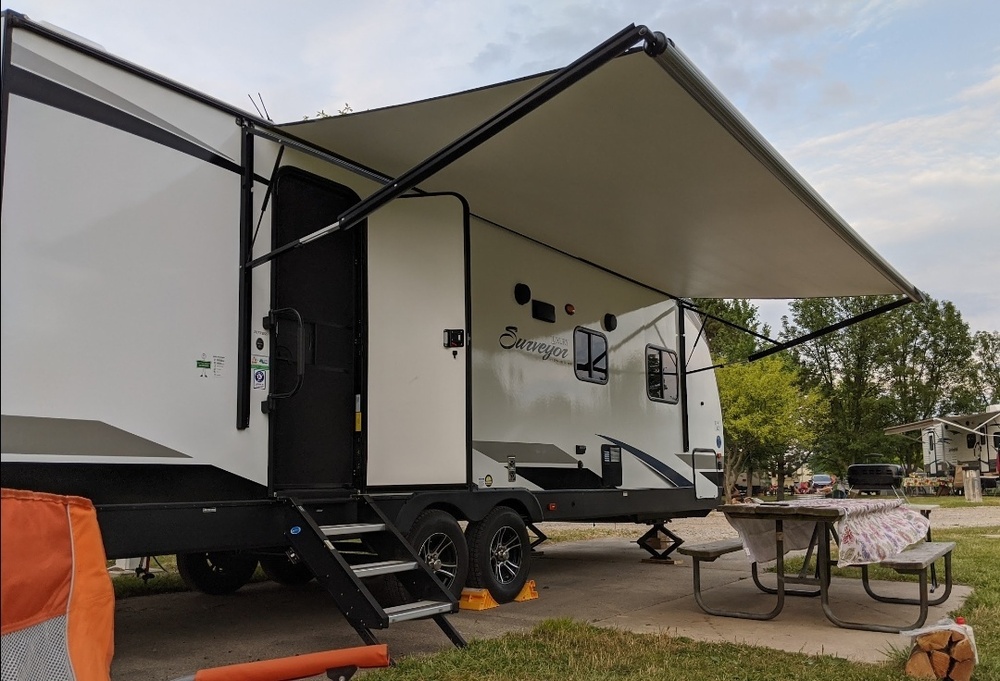 Surveyor Luxury 30' travel trailer in well-kept condition. Roomy bathroom with large corner shower. Open floor plan with dinette, leather theater seats, full size refrigerator, stove with oven, microwave oven, double size kitchen sink and TV with fire stick. Regular size queen bed with memory foam, pad and bedding. Furnace and central air conditioning in good working order. New tires and battery installed in 2024. Electric awning. 40 gallon black tank and two 30 gallon gray tanks, all heated. Electric tongue jack. Weight distribution hitch and stabilizer bars included. Also includes gas grill, Blackstone griddle, 28 gallon tote, ladder ball, two outdoor rugs, 10' x 13' screen house, waste pipe, water hose, 30 amp plug in, jack blocks and many other miscellaneous items.