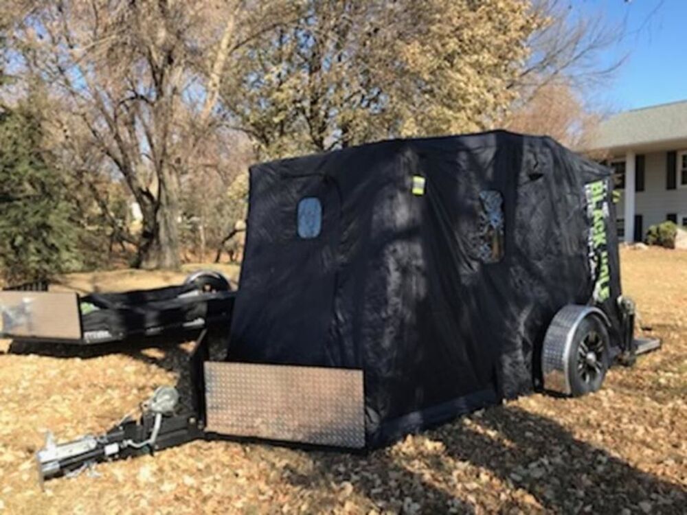 2023 Black Hole Outdoors Black Hole Ice Shack The Beast, **MAP Price includes freight and prep, but does NOT include any of the taxes and fees for the title.** "Hybrid portable fish house cross between a flip-over & wheel house, designed to haul your ATV or side by side to the lake for early/late ice as well as for all season." The Beast portable shack has a trailer bed of 16' to the nose, 14' full deck of Intelli-Core floor with a 12' insulated clamshell canvas. The Beast has 8 Catch Cover holes and 7 heavy duty D-Ring tie downs. The Clamshell is removable from the deck to use the trailer year around. This large canvas has Velcro out window panes, Optional Velcro out screens may be purchased, crank down deck and Crank down tongue, removable front shields double as a loading ramp. Hunting, Fishing, Camping, and Hauling! Quick Clamp products available (rattle reels, cup holders, power boxes, and more).