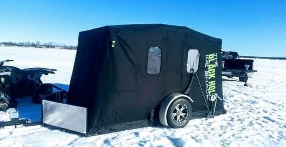 2023 Black Hole Outdoors Black Hole Ice Shack Sasquatch SPEAR Hole, *MAP Price includes freight and prep, but does NOT include any of the taxes and fees for the title.* "Spear House Hybrid portable fish house cross between a flip-over & wheel house, designed to haul your ATV or side by side to the lake for early/late ice as well as for all season." The Sasquatch portable shack has a trailer bed of 14' to the nose, 12' full deck of Intelli-Core floor with a 12' insulated clamshell canvas. This Spear House Sasquatch has 5 Catch Cover holes plus SPEAR HOLE and 5 heavy duty D-Ring tie downs. The Clamshell is removable from the deck to use the trailer year around. This large canvas has Velcro out window panes, Optional Velcro out screens may be purchased, crank down deck and Crank down tongue, removable front shields double as a loading ramp. Hunting, Fishing, Camping, and Hauling! Quick Clamp products available (rattle reels, cup holders, power boxes, and more).