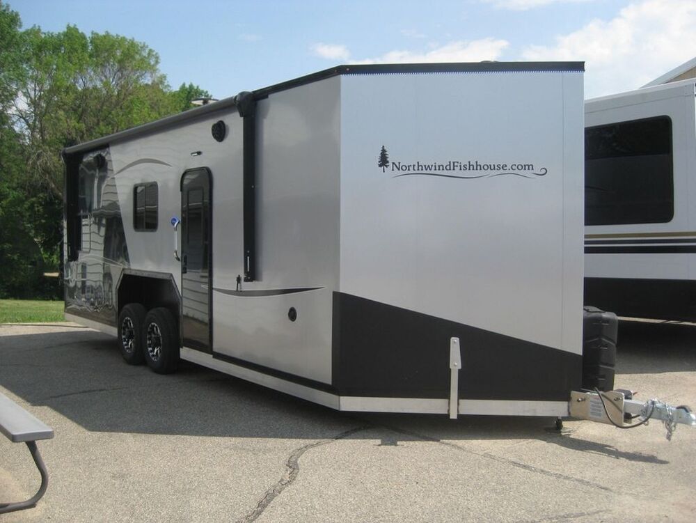 2024 Northwind Trailer Group Northwind Fish House NW24 TH, NO Hidden Fees or Charges! This price includes freight and dealer prep; including filled LP tanks, battery, power adapter down to 110V, sewer hose, tank chemical, & 1 package of toilet paper. The only additional charges are related to the sales tax, title, and registration fees. Amazing toy hauler with BACK SWING DOOR that has a window in it, Air, powered awning, 100 watt solar panel, Soft touch & Knotty pine interior, 60" Eurobed Liftco lift bed and 2 Flip over sofas at the back, Jack-knife Sofa with 42" bunk above, shower, toilet, and sink in the bathroom in the front V, electric fireplace, TV & TV antenna, microwave, 36,000 BTU Suburban furnace, ceiling fan, furniture upgrade, range top & oven, 110 refrigerator, spare tire mount (tire not included), two tone exterior in Silver & Black, Fob controlled hydraulic lift and level system Setting up is truly as easy as the push of a button!