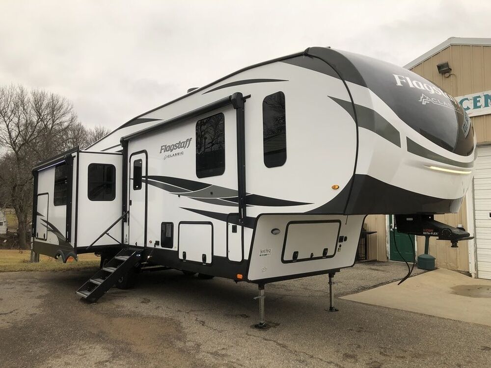 WHEN YOU WISH TO UPGRADE YOUR CAMPING EXPERIENCE, EMBRACE OUR CLASSIC LINE OF 5TH WHEELS. Elevate your journey with the quintessence of Flagstaff's first-in-class quality and exceptional craftsmanship, now augmented by a host of supplementary features to enrich your journey. Anticipate superior offerings such as king-sized beds, effortless electric auto-leveling, shielded metal awning covers, exquisite upgraded solid-surface countertops, and the luxury of residential soft-close drawers. Every Classic 5th wheel now comes with an option for our power package, propelling you to destinations you once deemed beyond reach.