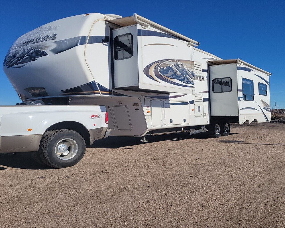 2011 Keystone Montana 3150RL 5th Wheel RV Trailer for Sale in Denver. 3-Slides with Slide Covers, King Bed, Spendide 7100 XC Combo Washer/Dryer, Pass Through Storage with Slide Tray, 15,000 BTU AC, 35,000 BTU Furnace with 10 Gal. Water Heater, 50 AMP Shore Power with Roll IN/OUT Reel, E-Z Lube Axles with 8 Lug Aluminum Wheels, Michelin Tires Size235/80R/16E (DOT 12/17) and Spare Tire, Manual 4-Point Leveling System, Enclosed and Insulated Water Lines and R38 Rated Insulated Roof. 32” HD Flatscreen Samsung Living Room TV and 20” Jensen Flatscreen Bedroom TV, Electric Fireplace, Central Vacuum System, (2) High Back Recliners, Sleeper Sofa, 4-Chair Dinette Table that Slides and Swivels, Double Sink with Pull Out Extension Facet, Convection Microwave, 2-Door Refrigerator (No Ice Maker), 3-Burner Stove with Oven, Kitchen Pantry and Vinyl Flooring, Large Glass Shower and Porcelain Toilet with Foot Flush. Cedar Lined Closet with Sliding Glass Doors, Security Safe under Bed. Living Room Ceiling Fan and Separate Work Desk with Chair. Please be Sure to Watch Our Video of the Trailer and Truck Plus all the Additional Extras included in this Sale! Items include: Trailer Tripod Stand, Hoses, Chalks, Parking Pads, Dishes, Pot & Pans etc.