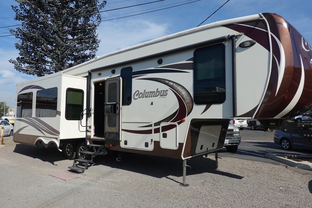 CALL FOR INFO 855-263-1595...OPEN MOST WEEKDAYS 9-4 AND AFTER HOURS OR SAT/SUN BY APPOINTMENT...BETTER THAN ANY TINY HOME AT A FRACTION OF THE COST!!! 2014 COLUMBUS PALOMINO BY FORREST RIVER MODEL 340RK TRIPLE SLIDE. Quality built, fully self contained and loaded with 15K roof air conditioner, 16' power awnings, 40K btu furnace, electric heat fireplace, 10 gallon dsi gas/electric water heater, cooktop/oven, convection microwave, 4 door 2-way refrigerator, washer/dryer hookups, ceiling fan, 2 flat screen tv's, roof ladder, swing up cargo rack and more. Great rear kitchen floor plan with large living area with 2 recliners, queen size sofa/sleeper and entertainment center. Spacious front island king bedroom suite, and private solid door bath with over sized shower. Quality built with aluminum frame, molded fiberglass front and back caps, 50 amp power service, 6 point computerized jacks, aluminum wheels, solid surface counter tops, loads of basement storage, and enclosed belly. Would make a unbelievable luxury instant Granny Flat!!! As always we include water reduction pressure valve, water hose, 30 to 15 and 30 to 50 amp connectors, sewer hose and a thorough walk through orientation. This one is ready to hit the road...non smoker, no pets and lots of extras. Priced to sell at only $21,950.00 Vin#003736. For more information or viewing call Hit The Road RV at 855-263-1595. Price does not include $85 doc fee, sales tax of your CA zip code or DMV registration/transfer fees.