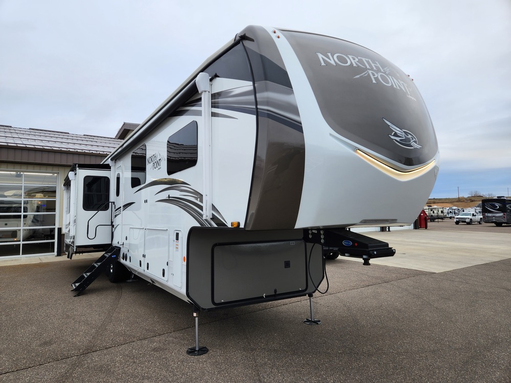 These Jayco North Point fifth wheels offer sleeping spaces and luxurious features to accommodate all types and sizes of groups! You will have generations of family fun with construction features like the Stronghold VBL™ aluminum framed, vacuum bond laminated walls and a Magnum Truss™ XL6™ roof system with a one-piece, seamless DiFlex II material which is the strongest tested roof in the industry. There are three mandatory packages to make your traveling experience even better. One of the packages is a five star handling package which includes Dexter axles with Nev-R-Adjust brakes, Dexter heavy-duty shackles with wet bolt fasteners and bronze bushings to resist the wear and tear of towing, Goodyear beast tires, a MORryde rubberized suspension system, and a MORryde pin box so you can travel forward, backward, and side-to-side for a smoother tow. Come choose your favorite model today!