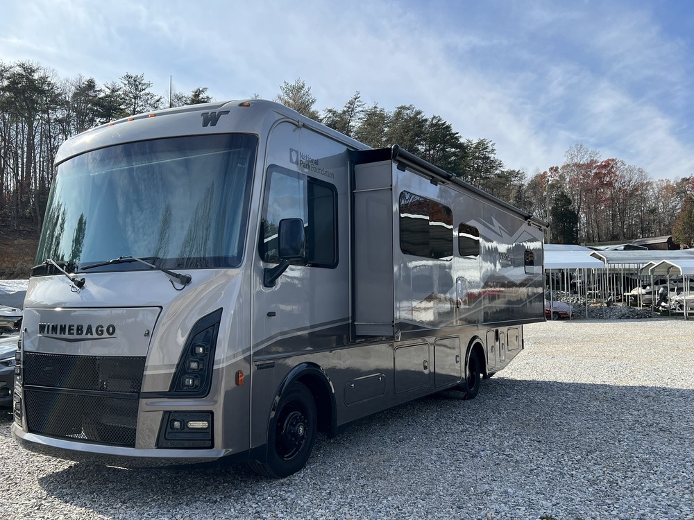 This beautiful motorhome is FULLY LOADED with every available option! With its Lithionics 320AH Lithium house battery, three 115W roof mounted solar panels and 30 amp charge controller which can be augmented by a 5,500W Onan gas generator, it is also uniquely designed to keep you totally comfortable whether camping with full hookups or boondocking while nestled in a national or state park!The interior features a Town and Country color scheme and styling. The dinette has a Hi-Lo table with storage which can double as a standing work station. The living area has upgraded theatre seating and a 39 LCD HDTV. The multi-adjustable slide/recline driver and passenger seats increase the seating capacity and function of this area. The galley has ample storage space, Corian countertops and backsplash with tile inlay, stainless steel double sink, large two door 10 cu ft/12 VDC stainless steel refrigerator/freezer, microwave, and a three- burner range with the optional large oven. The bath features a large 26X 38 shower with textured glass door, Thermaform countertop, and porcelain toilet. The bedroom has a king size bed, 32 HDTV, and plenty of storage space in two large wardrobes, under-bed and overhead storage areas. There is also a 50X80 powered StudioLoft overhead bed in the cab area. The interior is kept comfortable in any weather with two 15,000 BTU AC units and a 35,000 BTU low profile furnace. The exterior is as beautiful and functional as the interior with exclusive National Park themed full body paint scheme, a large outdoor kitchen, armless powered awning, 270 degree Bat wing awning, and 39 HDTV.This is a well built beautiful motorhome with a spacious interior, numerous creature comforts, a large outdoor kitchen/ entertainment center - all on a Ford F53 30ft chassis designed to fit into most campsites at any of your favorite destinations!!!