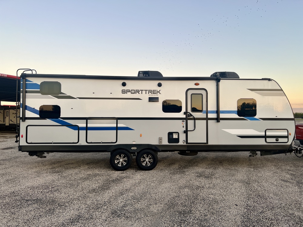 For sale: 2021 Venture RV Sport Trek 281VBH; non-smokers and covered storage with 7600 miles total. It has 2 A/C units that keep it cool no matter the outside temperature. Includes Goodyear Endurance tires. It is a top-of-the-line travel trailer that offers luxury, comfort, and convenience on the road. The 281VBH trim level boasts a spacious interior layout that can accommodate the whole family or a group of friends. With 7600 miles, this travel trailer is barely broken in and ready for many more adventures. The Venture RV brand is known for its high-quality construction and attention to detail, and the SportTrek is no exception. From the exterior features like an electric awning and outdoor kitchen to the interior comforts such as a full kitchen, bathroom, and sleeping quarters, every aspect of this travel trailer is designed with the user in mind. The 281VBH floor plan includes a master bedroom, bunk beds, a dinette that converts into a bed, and a spacious living area for relaxing or entertaining.Whether you are heading out for a weekend getaway or embarking on a cross-country road trip, the Venture RV SportTrek 281VBH has everything you need to make your journey comfortable and enjoyable. With ample storage space, modern appliances, and premium finishes, this model is sure to impress even the most discerning traveler. Overall, the Venture RV SportTrek 281VBH is a fantastic choice for anyone in the market for a travel trailer that offers luxury, comfort, and style. With its modern design, spacious layout, and top-notch features, this model is sure to provide countless hours of enjoyment on the open road. Don't miss your chance to own a piece of adventure with the Venture RV SportTrek 281VBH. Includes the eaz lift ReCurve 3 Hitch System.