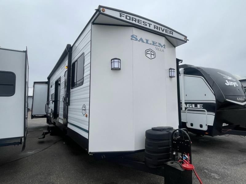 The Forest River Salem Villa Series destination trailer offers you an excellent space to relax in and rejuvenate your adventurous spirits! The construction has been built with 2" wall studs, 5" bowed truss roof rafters, Dicor PVC roof membrane, and fiberglass insulation throughout. The 8' interior height is going to provide you with an open and spacious living area, and the heated and enclosed accessi-belly will protect your trailer from the elements. The Salem Villa Series comes loaded with upgraded designer furniture, a Serta mattress, stainless steel appliances, seamless countertops, and extra-large windows for cross ventilation. There is also a few new features, including Jubilation vinyl flooring in the slide outs instead of carpet, an upgraded shower head, a 60K tankless water heater, and more comforts!