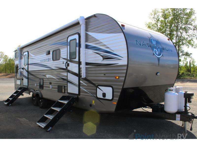 Make your vacations complete with this Navigation travel trailer! The dual entry doors are a huge convenience since mom and dad will have their own entrance into the front private bedroom, and the kids can easily access the bunk beds and full bath with ease. There is a large walk-in pantry and a two-door 12V refrigerator that will come in handy when packing food for the week, plus you'll find overhead cabinets for all your necessities. There is also a pass-through storage and convenient trunk storage outside below the bunks for the kids' scooters or extra coolers. This model also includes a walk-around king bed in the front private bedroom, along with dual night stands and spaced prepped to add an optional TV if you choose!