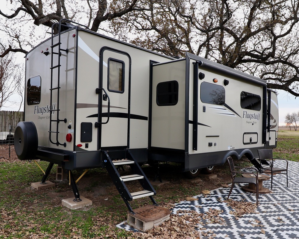 Priced For Quick Sale! Our big bunkhouse travel trailer in super clean condition is for sale! This 29 foot bunkhouse travel trailer is an excellent job site trailer and also a wonderful family adventure trailer. With two entry doors, an ensuite master bath, and an ensuite bunkhouse bathroom, this rare floor plan is highly functional and easy to fall in love with! My wife and I have used it as a property access home, allowing us to move onto a property before we had a livable home. We’re now relocating back to the pacific northwest and it’s time to sell our trailer. We’re including everything shown in the pictures, including the stabilizing jack stands, masonry blocks, heated water hose, sewer hose setup, electrical surge protector/voltage booster, trailer tongue lock. The excellent condition of this trailer must be seen to be appreciated! We're the second owners. We bought the unit late in 2021 from Fun Town RV in Cleburne TX. It looked like brand new. Since that time it's been parked in one location and so has very few road miles. It's not had pets, smoking, or children, just my wife and I. The bunk room has a flip up upper bunk and a convertible jack knife couch down below. I REALLY loved having the rear bath entry. It allowed me to put a mat and towels down to use the rear bath like a mud room. This made it very easy to keep the entire trailer really clean.