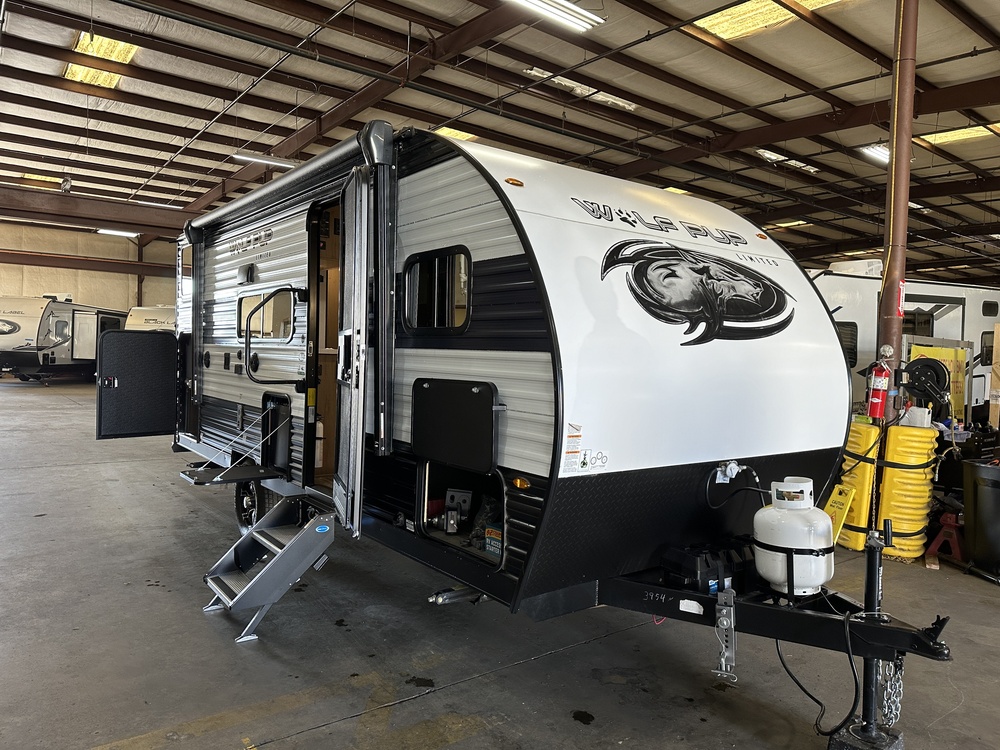 The 2023 Forest River Cherokee Wolf Pup 17JG is a compact travel trailer that's designed for outdoor adventures. It has a spacious interior, a fully equipped kitchen, a dining area that converts into a sleeping space, and a bathroom with a toilet, shower/sink combo, and tankless water heater. The trailer also has a power awning, outdoor speakers, and exterior storage compartments.