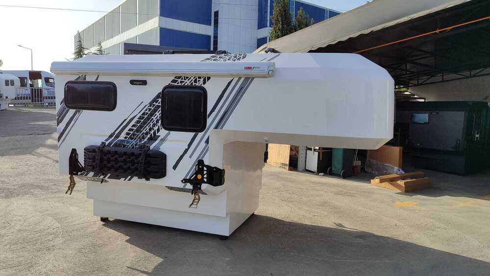This is a single mold Fiberglass camper made by Hotomobil.It is 6'3" long, 1900lbs dryWhite Gelcoat with graphics. It has 18mm Polyuretane insulation all around to keep the cold out when it is cold, keep the heat out when it is hot, and keeps the noise out.Comes with a diesel heater, diesel water heater, wetbath with cassette toilet, outdoor shower with enclosure. 2 burner propane stove galley is great to cook with. 12V compressor fridge, 205W solar panel with 110V AC plugs, and a queen bed.The finish is luxurious.It has just enough you will need to enjoy your time outdoors, and nothing less than you deserve. Comes with an awning too.Jacks can be left at home while traveling to sve weight, or installed pointing upwards after mounting.