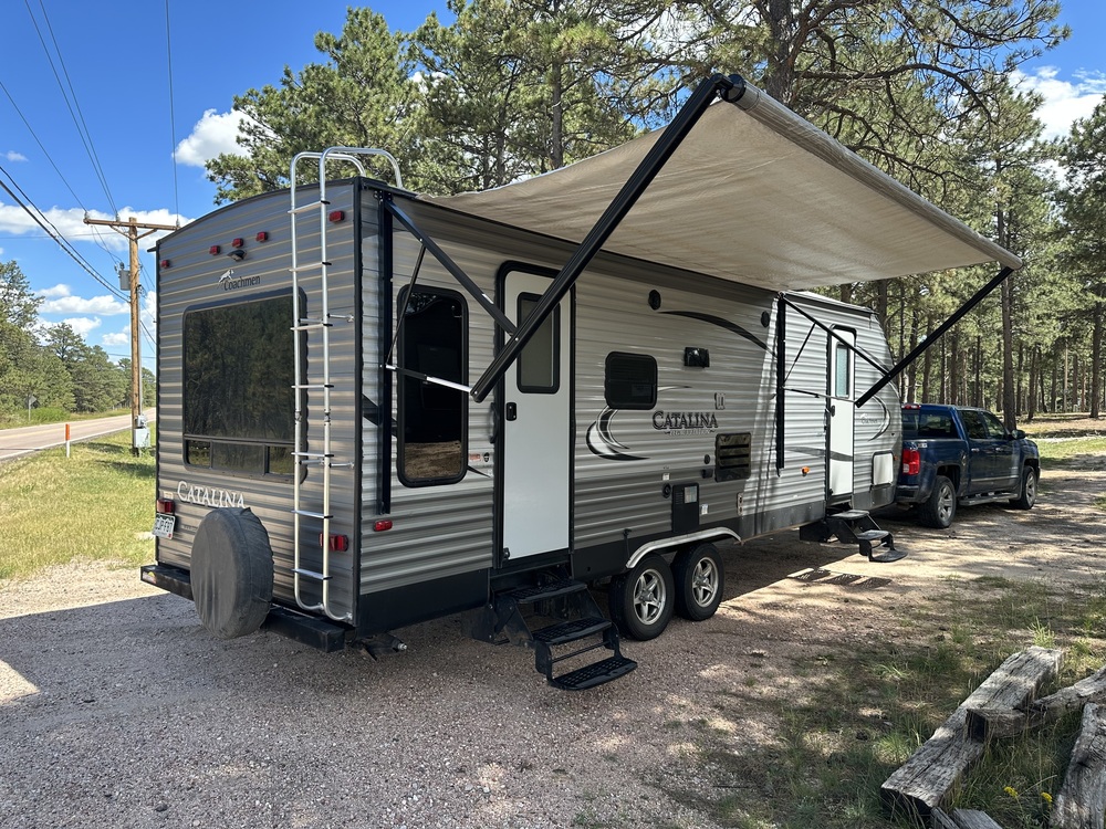 The 2017 COACHMEN CATALINA LEGACY EDITION 263RLS is a 29 foot top-notch travel trailer that has been well-maintained with 20,000 miles on it. This trailer proved to be durable and gave us no issues during a road trip through the western US and provided us with the convenience and comfort of being at home but in beautiful, remote places. This trailer is fully equipped for boondocking and we were able to stay completely off grid for an average of two weeks before needing to restock/empty. The spacious interior is designed for maximum convenience, with two desk areas in the large rear window, both of which can be easily removed to add more seating or sleeping areas. We bought a brand new sleeper couch to ensure maximum comfort, it has a fully-equipped kitchen, and a comfortable bedroom (Mattress, just not shown in pictures and pictures can be provided if needed). This Catalina is ready to go the extra mile with 3x 250w solar panels on the roof. We were able to work remotely with two monitors, watch tv, use an air fryer and air conditioning (conservatively, it is a battery of course), all from our solar batteries. This allowed us to camp in extremely remote places, work and play, amongst stunning views and quietness. The solar and water allow you to go off grid for an average of two weeks with a 46 gallon fresh water, 40 gallon gray water, and 30 gallon black water tanks. It has an 15 ft awning to provide ample shade and plenty of outside storage for all you campfire needs and an outdoor shower to handle any pesky or muddy kids or pets.