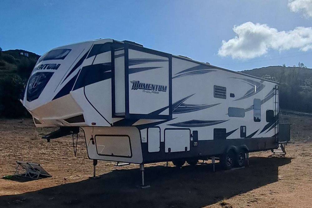2017 Grand Design Momentun M-class 328m fifth wheel toy hauler.This m-class 5th wheel features 2 slide outs and 3 queen size beds. A 10' garage with Happi-jac electric queen size bunk beds, folding sofas and dinning table. Quick setup ramp door patio system with awning & patio steps with handrail. Kitchen / living room features a large sink, counter space, 3 burner range with 22" oven, 30" microwave, 18 cu ft refrigerator, large pantry, central vacuum system, 2 person recliner, swivel rocker recliner and 40" tv.Up the stairs is a side aisle bath with a toilet, sink and shower with skylight and seat. The private front bedroom has a queen size bed with nightstands on both sides. There is also overhead cabinets and a large slide out wardrobe with drawers, also a 32" tv.There is a 5.5 kw gas generator, a 30 gal gas fuel station and a 95 watt portable solar panel for keeping your rv running when camping off grid Original owners, no pets, non smokers.New tires last year, new brakes and bearing serviced two years ago.Note: large awning has a bent left arm (non motorized) and needs replacing. Local pickup only in Jamul, CA $42,500.