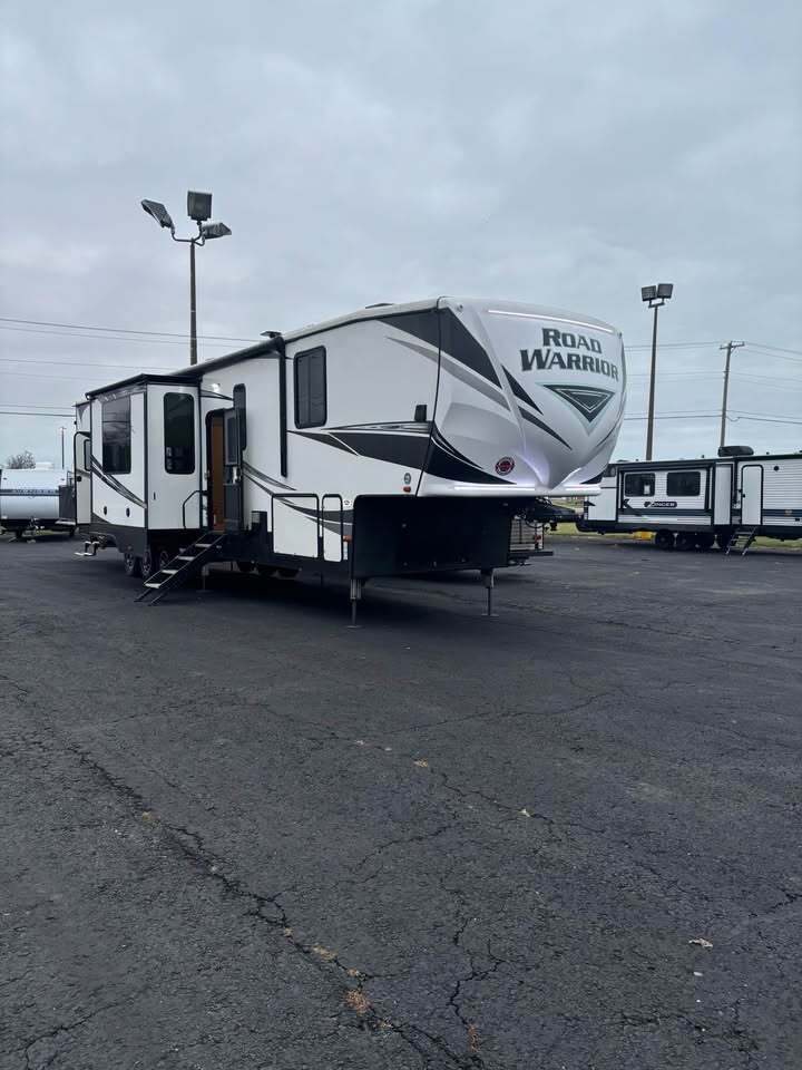 Beautiful 2019 Heartland Road Warrior 426RW! It is hard to pick the first thing to mention about this behemoth of a unit. Together, if we start at the front door you will see an open island kitchen complimented by a large residential refrigerator, a 3-burner stove with a vented hood, an oven, and a microwave. Directly adjacent to the kitchen is a 4-seat reclining bench with a great TV view and fireplace for those colder nights. Before we head to the garage, you will notice a cozy loft above you.