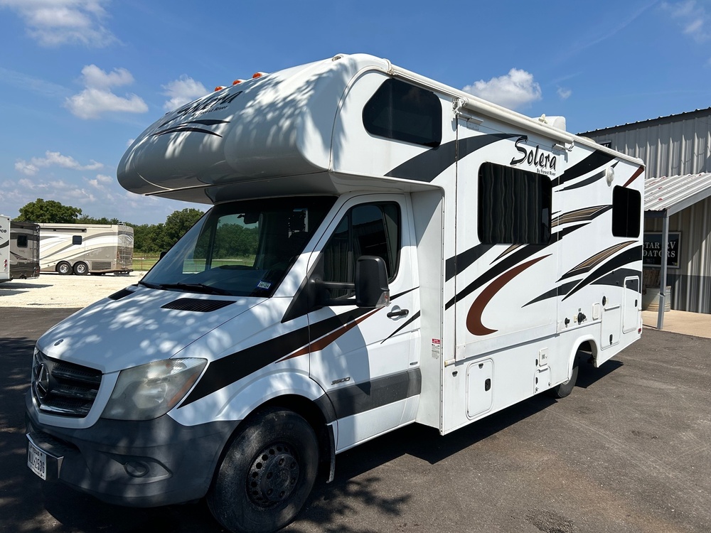 2014 Forest River Solera 24R with 2 slides and 121978 miles. This RV is 25' in length with a Mercedes 3.0 Diesel, 3500 chassis, 3.6 KW Onan LP generator, slide-out room toppers, cab over bunk, and ducted roof A/C.