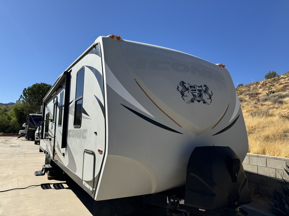Great condition 2017 Iconic 2816SWG toy hauler. Garage 12’ to first cabinet 16’ total. Fits 4 seat RZR. 4K Onan generator, fuel station, electric awning, power tongue jack, solar, dual propane tanks, 2 6v batteries, outside shower, spare tire, AC 15k BTU ducted, heater 30k BTU ducted, 10gal do water heater, 150 gal fresh tank, 50 gal grey and black tanks, 32” TV w/ Jensen stereo system dvd player inside and outside speakers. Sofa slide out, two rear beds, one converts to a second couch. Two captains chairs with table. Front bedroom, upgraded queen mattress, storage under bed. Microwave, 3 burner stove with oven and refrigerator. Side and rear flood lights.