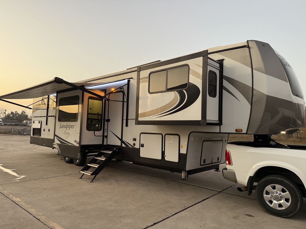 No vacation is complete without the Sandpiper Luxury fifth wheel! The master suite steals the spotlight with its king-size bed on a slide-out and a full bathroom featuring a dual-sink vanity. Another highlight is the front separate living room, which offers a cozy retreat with its entertainment center, fireplace, and 50" LED HDTV. This space includes two opposing hide-a-bed sofas and theater seating, making it an ideal spot for gatherings. Plus, the sofas double as guest beds for overnight stays. The centrally located kitchen is both functional and stylish, equipped with a four-burner range, a 19 cu. ft. stainless steel 12V refrigerator, and a ceiling fan to keep you cool while cooking. A convenient half bathroom is also located here for easy access.The Forest River Sandpiper Luxury fifth wheel truly lives up to its name, delivering exceptional features and quality construction. Built on a welded aluminum-framed, vacuum-bonded laminated superstructure with a cambered powder-coated frame and rust protection, its designed for durability. The fully enclosed, heated underbelly and spacious drop-frame pass-through storage with cable jacks and a 110V outlet add practicality. Exterior features like two LED-lit speakers and a docking station with winterization capabilities, a hot/cold spray port, black tank flush, and tank pull valves enhance convenience. For off-grid adventures, the GoPower 200W roof-mounted solar panel with a controller and battery ensures independence.Inside, luxury abounds with 84" ceilings, solid surface countertops, recessed lighting, oversized picture windows, LED-lit headboards, and a premium sound bar with a built-in flush-mount DVD player. Every detail is crafted to make your travels as comfortable and stylish as possible.