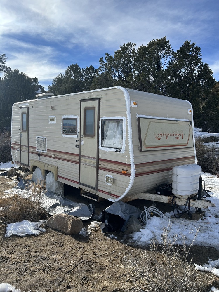 This camper has working plumbing, septic system, a fridge, oven, stovetop and a working furnace (does need cleaned). We have never used the hot water but the previous owner told us it was working fine. The only thing that could use work are minor cosmetic issues. We just put on a fresh coat of flex seal which is the white on the corners - She could use a new paint job. Sleeps 5 with the mattress and use of bunks. Two of the bunks can be folded up for extra storage. ~3,500lbs dry weight.