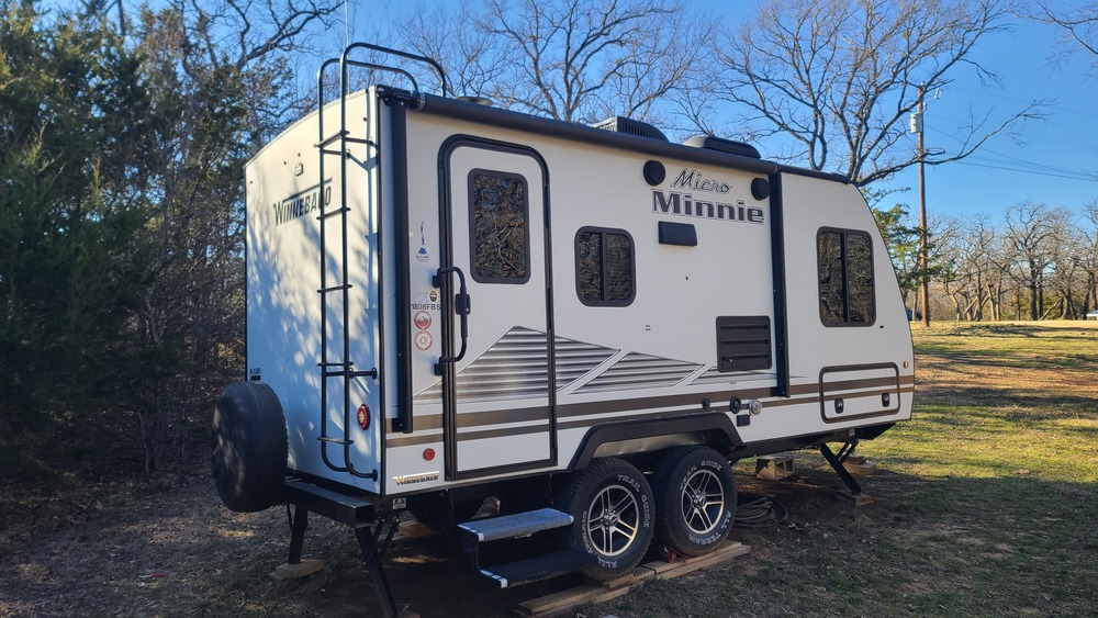 2020 Winnebago Industries Micro Minnie 1808FBS, Travel Trailer, Used 2020 Winnebago Industries Micro Minnie 1808FBS Winnebago Industries Micro Minnie travel trailer 1808FBS highlights:RV Queen BedDivider CurtainBooth DinetteTV CabinetFull Bath. This travel trailer can sleep four. Three-burner range/oven and stainless steel sink + water filter. You'll appreciate the full bath at the end of the day to clean up and the dinette will be a great spot to play a game of cards. The dinette can also be used as sleeping space for the kids while mom and dad sleep on the front RV queen bed that includes a divider curtain for more privacy. With each Micro Minnie by Winnebago Industries Towables, you will find plenty of modern conveniences, like the 13,500 BTU air conditioner and Noble Classic high-gloss fiberglass sidewalls, all in a compact and easy-to-tow package. You will also find an LED TV, an AV system with AM/FM/CD/DVD/USB/Bluetooth for indoor entertainment, exterior speakers to crank up the tunes, and an electric awning with LED lights for protection from the outside elements while you're gathered together around the campfire or simply enjoying the fresh air. 400w Solar System w/200ah Lithium Battle Born Batteries, 2000w inverter, External solar input port with separate charger controller for option to increase solar input, Maxxair Ceiling Fan w/remote, Thermostat for A/C & Heat, Easy Start A/C Soft Starter, Blue Ox BXW0650 Track Pro Weight Distribution Hitch (600lb Tongue Weight), Like new Wilderness RV Mattress (firm).